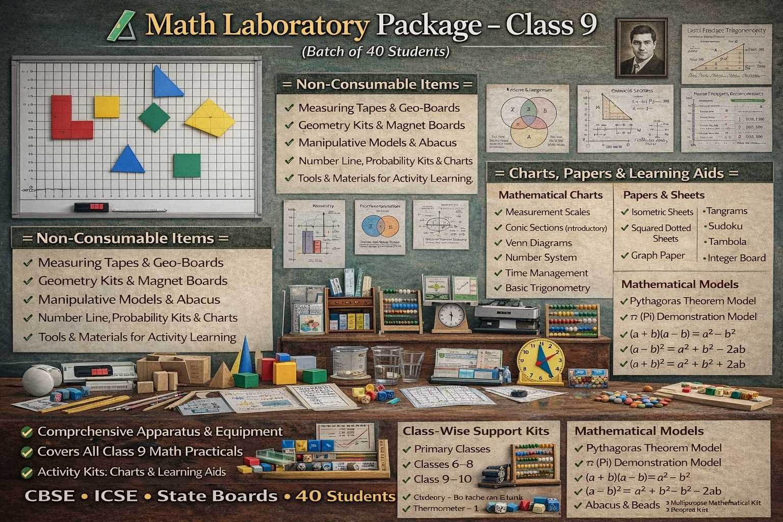 Whether you are setting up a new Mathematics Laboratory or upgrading an existing one, this package ensures durability, accuracy, and long-term usability.